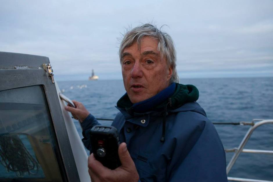Professor Bob Lloyd, director of Energy Studies at the University of Otago, sends a message to the drill ship the Noble Bob Douglas explaining his opposition to deep sea drilling. The Oil Free Otago flotilla is a coalition of Otago residents who oppose deep sea drilling off our coast. Photo by Nick Tapp – nicktappvideo.com