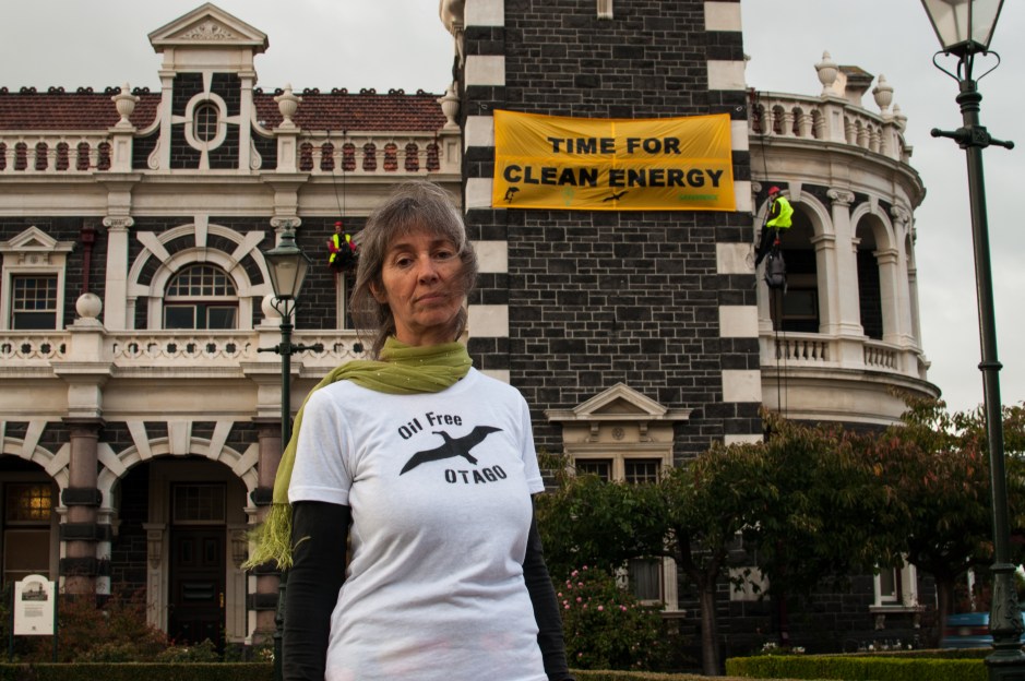 Oil Free Otago spokesperson Rosemary Penwarden stands in front of Oil free and clean energy campaigners from around the country deploying a banner from the Dunedin Railway Station clock tower. The action comes as Anadarko’s drillship, the Noble Bob Douglas, leaves for the Gulf of Mexico after failing to discover any ‘significant’ oil or gas reserves off the coast of Otago. The banner message “TIME FOR CLEAN ENERGY” highlights the need for the government to invest in clean energy projects instead of deep sea oil and gas drilling.