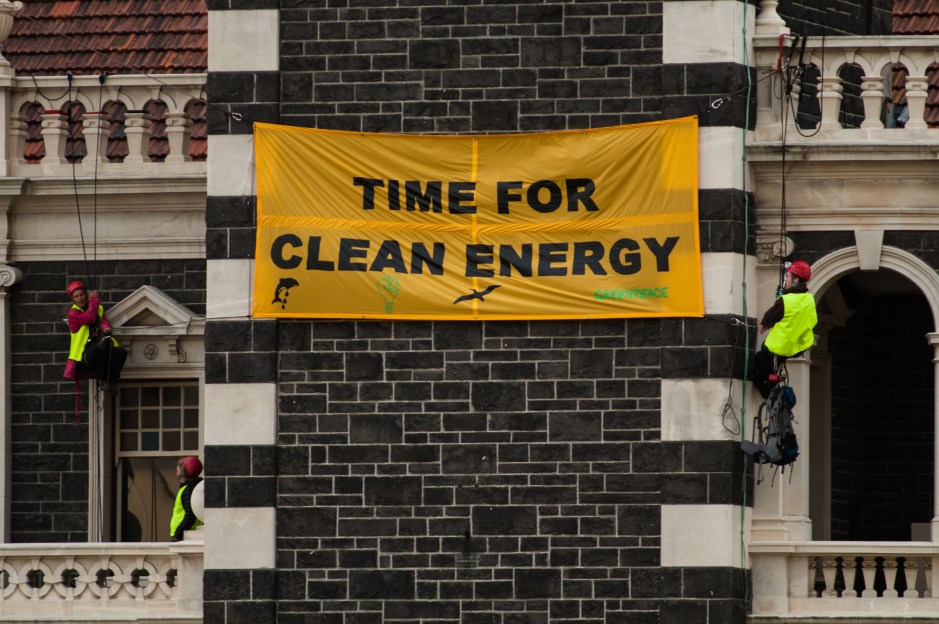Oil free and clean energy campaigners from around the country deploying a banner from the Dunedin Railway Station clock tower. The action comes as Anadarko’s drillship, the Noble Bob Douglas, leaves for the Gulf of Mexico after failing to discover any ‘significant’ oil or gas reserves off the coast of Otago. The banner message “TIME FOR CLEAN ENERGY” highlights the need for the government to invest in clean energy projects instead of deep sea oil and gas drilling.